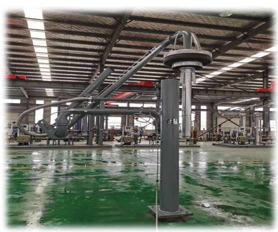 鶴管主要由固定、回轉(zhuǎn)、操作、平衡等機構(gòu)和油管組成。其中回轉(zhuǎn)機構(gòu)(回轉(zhuǎn)接頭)是用鍛鋼或鋁合金精心制造,內(nèi)裝復(fù)列球軸承,不銹鋼特殊密封圈,它旋轉(zhuǎn)靈活、密封性能可靠、經(jīng)久耐用。平衡系統(tǒng)有配重、扭簧、壓簧、拉簧和絲杠以及液壓和氣動平衡等型式,均能以很小的力進行操作。